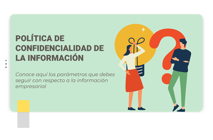 Así es nuestra política de confidencialidad de la información Recuerda que debes tratar en forma estrictamente confidencial toda información no pública que llegue a tu conocimiento relacionada con los asuntos y negocios de la empresa, incluyendo la información corporativa, informes financieros, planes y estrategias de mercado, bases de datos, listas de proveedores y clientes, documentos…